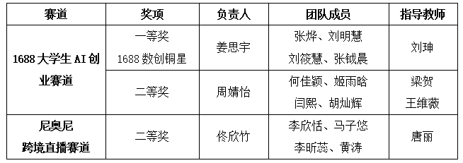 三支参赛队伍晋级国赛,共斩获1688大学生AI创业赛道一等奖一项、二等奖一项,尼奥尼跨境直播赛道二等奖一项,1688数创铜星奖一项,优秀指导老师奖一项。同时,无码av