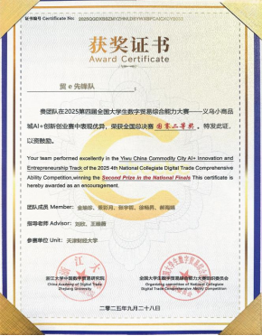 由金立智等五名同学组成的“第五象限突击”队荣获该赛道二等奖及义乌AI创业之星奖;金瑜珍等五名同学组成的“贸e先锋”队同样荣获赛道二等奖。