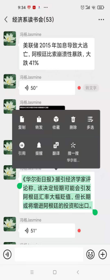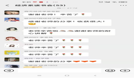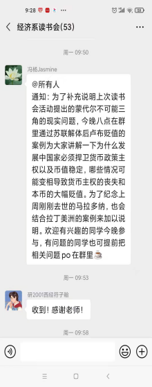 11月30日,周一晚八点,冯杨老师在“经济学读书会”微信群里跟学生们进行了一个多小时的交流互动,对本次读书会活动中学生们提出的“蒙代尔不可能三角的现实问题”,用语音、文字和图片等作了详细解答。学生们纷纷表示收获很大,衷心感谢冯老师。
