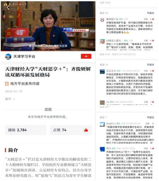 天财思享+专家团成员,利用“小而精”的网络课堂充实思政元素,引导学生正确认识中国开放型经济发展的特色和趋势,先后围绕党的二十大和中央经济工作会议以及天津港产城融合等专题进行微党课讲解四次,并被学习强国转载,使学生深刻理解中国作为世界大国的责任与大国自信,向学生讲好在复杂多变的国际经济形势下的中国开放故事。