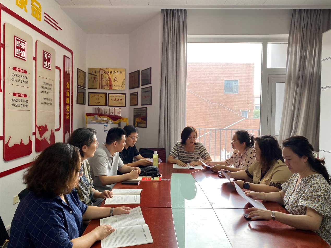 副院长耿伟教授主持,耿伟教授强调了深入推进学习宣传贯彻党的二十大精神、深入开展学习贯彻习近平新时代中国特色社会主义思想的重要性,号召全体教师以此为思想引领,切实推动学院教学工作高质量发展。韩廷波书记强调要把学习宣传贯彻党的二十大精神作为首要的政治任务和头等大事,以深刻领悟、全面宣传、扎实贯彻为重点,持续推进开展党的二十大精神学习宣传贯彻工作,真正筑牢“学”的基础、织密“思”的空间,做足“用”的文章,着力在师生学深学透、入脑入心上下功夫。院长齐俊妍教授传达了习近平总书记关于数字经济发展的重要讲话精神和贯彻落实国家“十四五”规划数字经济部署要求,阐述了产业数字化转型与数字产业化发展等问题,希望老师们在充分挖掘数据要素价值,激活经济发展潜力,释放数字经济活力,健全完善数字经济治理体系,确保数字经济安全有序、规范健康发展等领域展开进一步的科研探索。王维薇副教授结合教学竞赛和教学能力培训的相关心得体会,通过详细分解教学设计的撰写和实施,把党的二十大报告中新理念、新提法、新论断全方位融入到国际经贸专业课的课堂教学中,将其作为贯穿课程的核心内容进行讲授,让党的最新理论创新成果“带着热气”进教案、进课堂、进学生头脑;杨善奇博士分享了党的二十大精神融入政治经济学课程思政建设报告,该课程思政项目已顺利通过学校的验收。杨老师通过重新修订教学大纲、教案和编纂教学案例集等方式将党的二十大精神有机地融入到马克思主义政治经济学概论的课堂,取得了一系列成效。带领学生研读马列经典著作,发表学术期刊论文,参加大创项目,广受学生好评,还将马克思主义政治经济学概论教材里各章节中的经典理论与党的二十大精神有效融合的思政点进行了总结和分享,在加深学生对经典理论知识点理解的同时也提高了课程思政的教学效果。