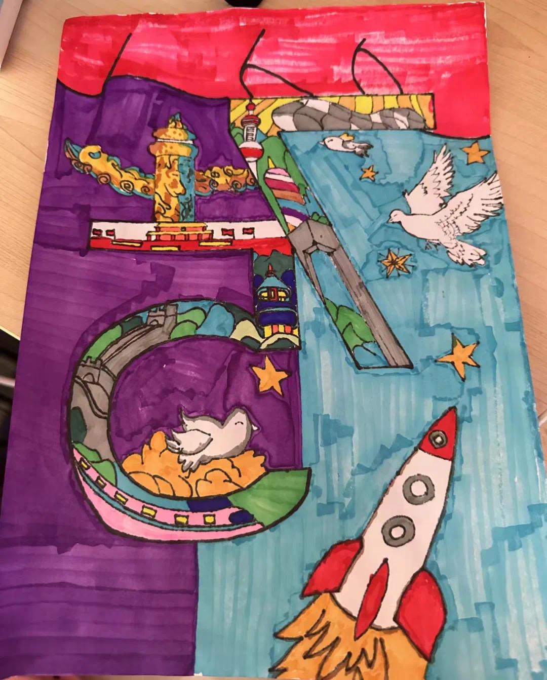 这是一幅精致细腻的画卷,学员们用新颖的笔触勾勒出剪纸的形态,又以许多充满中国意象的图案共同拼凑成共庆二字,给人以深深的震撼。飞扬的巨龙、飘扬的红旗、盛放的牡丹花、发射升空的火箭……小组成员们选取了诸多意象描绘了蓬勃发展的祖国。