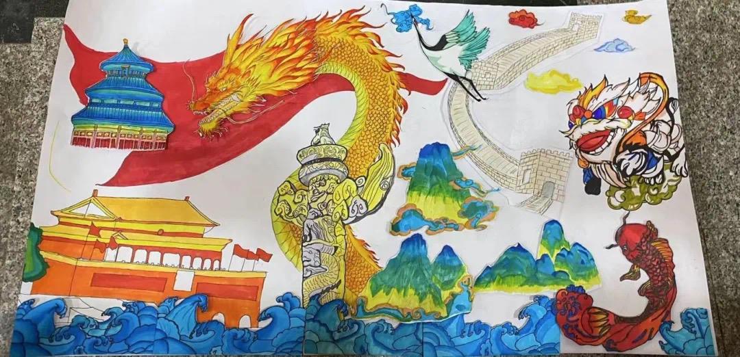 金色的巨龙盘旋在画卷中最醒目的位置,就如同当今的中国也是一条苏醒的东方巨龙。在金龙的周围,学员们辅以天安门、天坛、长城等中华民族具有代表性的建筑,并且用《千里江山图》中的配色来绘就山脉,处处体现着中国的传统文化。
